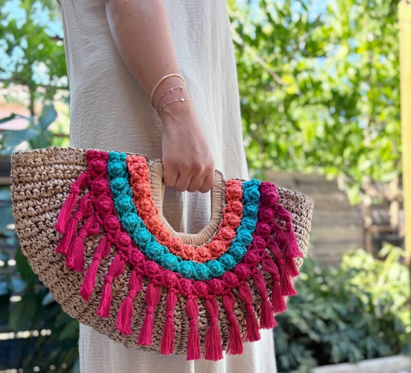 Les franges discrètes dansent comme les feuilles au vent chaud, et la paille tressée à la main porte en elle la patience, la transmission, le geste lent des femmes d’ici.